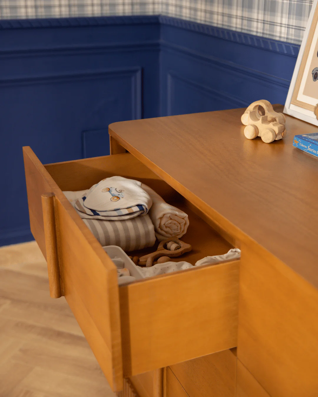 Crafted in a rich chestnut wood finish, this dresser is defined by its softly curved vertical edges, clean-lined drawer fronts, and sculpted fluted base. The proportions are balanced and architectural, yet gentle — making it feel just as appropriate in a nursery as it would in a beautifully layered bedroom years from now.