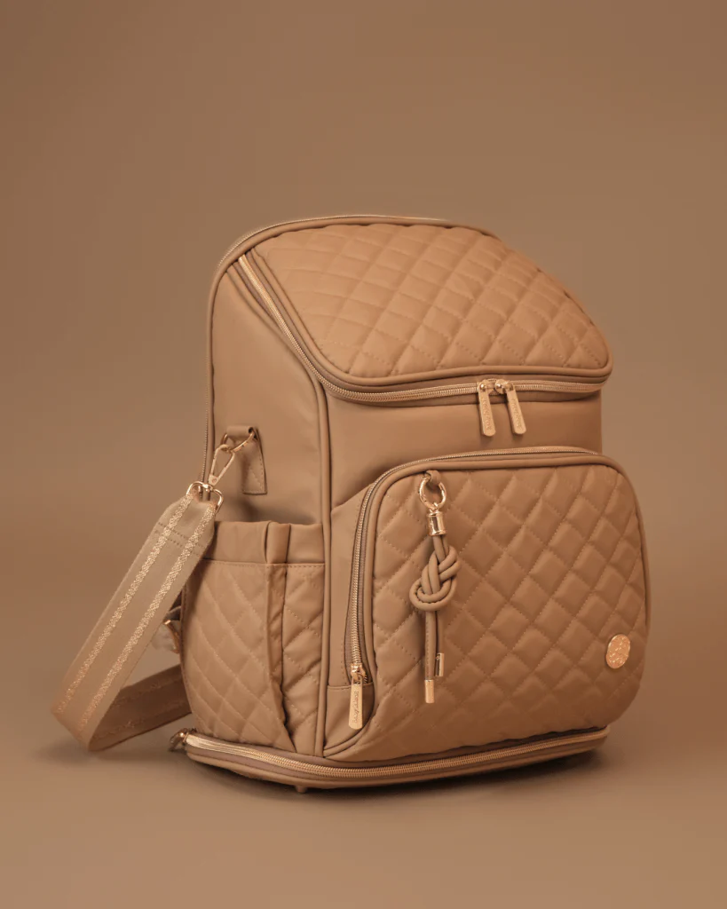The bag has multiple compartments, including bottle pockets and several zip pockets for organization.